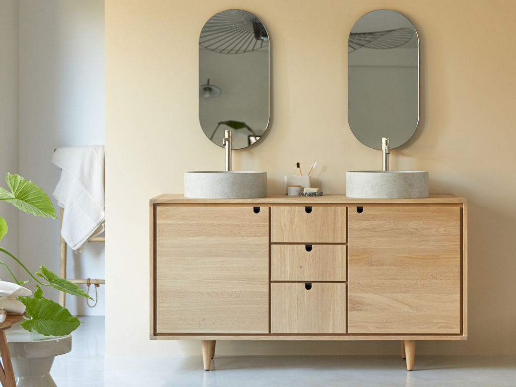 Si votre préférence va aux salles de bain épurées, choisissez un meuble vasque en bois au design minimaliste. Parce que le mélange des matériaux créent de beaux contrastes et que le bois a le don de rendre la salle de bain plus cosy. Un conseil pour rompre les lignes et les angles du meuble : associez-le aux courbes d’une vasque ronde.