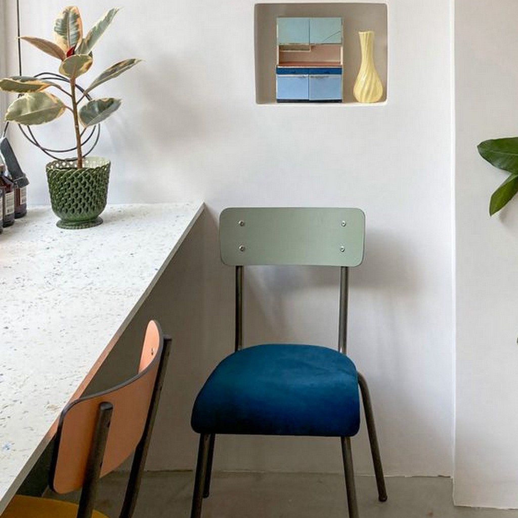 Les Gambettes s’associent à Klin d’œil le temps d’une collaboration autour de la chaise Suzie. Pour l’occasion, l’assise de la chaise écolier et de sa version chaise de bar sont habillées de velours. Attention, édition limitée.