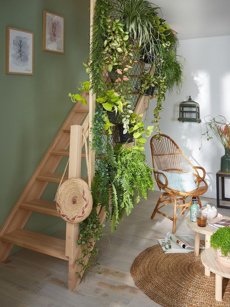 Végétaliser votre escalier en posant des plantes en pot sur la montée, c’est pile dans la tendance. Votre escalier intérieur est étroit ? Installez des pots suspendus le long de la rampe, faites-y pousser une plante grimpante ou optez pour des jardinières murales.