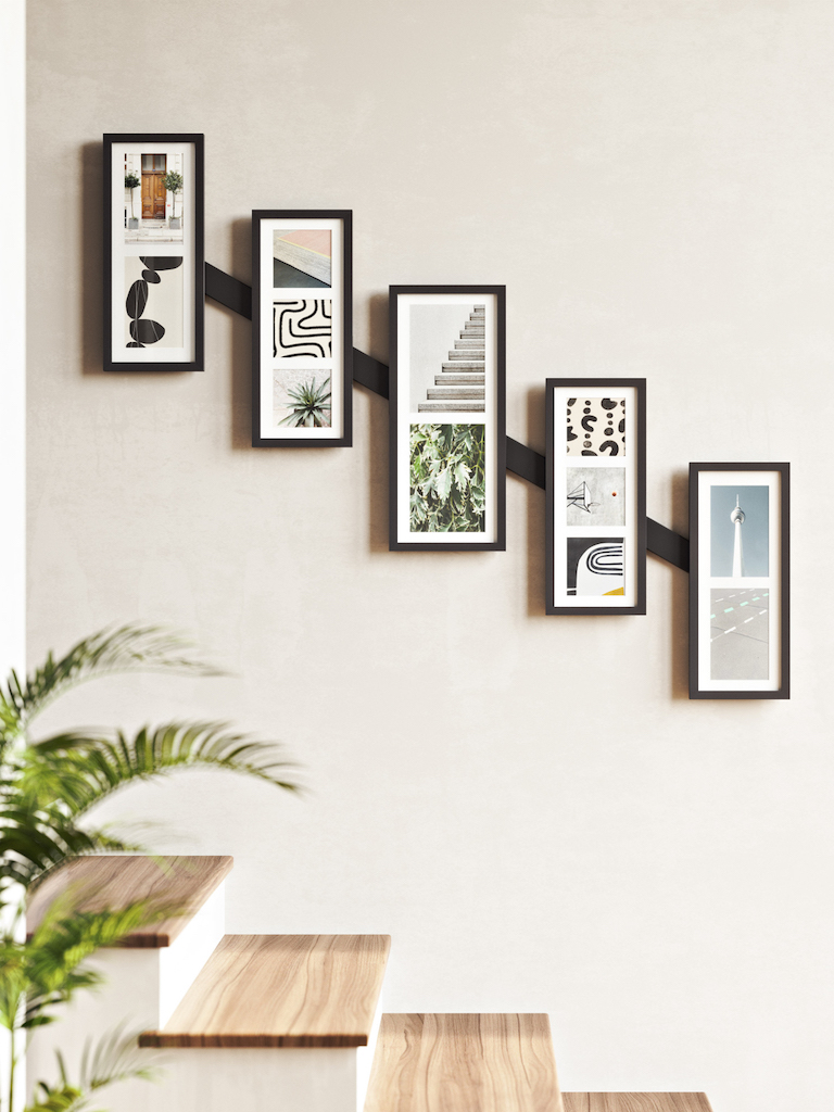 Accrochez des cadres tout le long de la montée, dans un angle, sur la hauteur. Il existe une multitude de tutoriels sur le web qui vous aideront à réaliser la composition parfaite pour exposer vos photos et affiches préférées. L’alternative au mur de cadres est le mur de miroirs : choisissez des modèles d’allure vintage, de formats et de matières différentes pour créer votre composition.