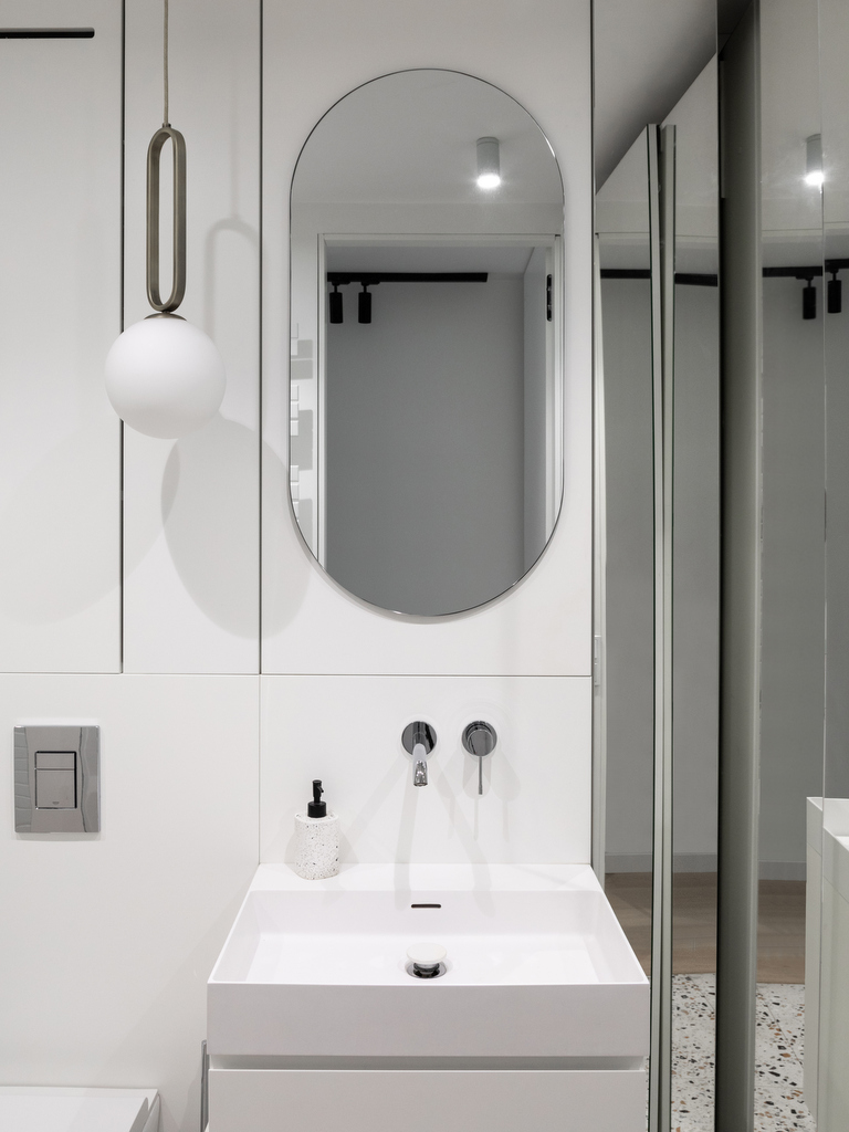 Dans l’appartement, deux astuces ont été largement utilisée afin d’accentuer l’impression d’espace. La première est l’utilisation de miroirs pour habiller les placards de la cuisine, de la chambre parentale et de la salle de bain. Ils apportent profondeur et luminosité à chacune des pièces. La seconde, c’est l’installation de portes coulissantes vitrées pour séparer différents espaces tels que la chambre parentale et la pièce à vivre. Elles permettent de laisser passer la lumière du jour et d’agrandir la perspective des pièces, renforçant la sensation d’espace.