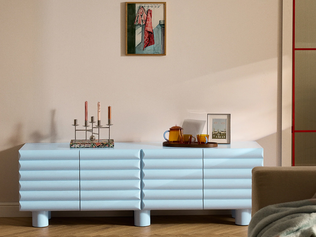 Le bleu ciel réapparaît chaque année au printemps dans les collections déco, généralement par touches. Mais en 2026, c’est un vrai parti-pris pour plusieurs marques qui choisissent cette couleur pour habiller leurs meubles ou leurs objets déco. L’éditeur danois &Tradition décline son canapé modulable Hi Lo dans un velours couleur azur ; la nouvelle table de repas de Muuto se pare d’un bleu clair, de même que les vases de Broste Copenhagen et la vaisselle d’Ib Laursen. Vous trouverez aussi du bleu glacier parmi les nouveautés HK Living, Noo.Ma ou &klevering.