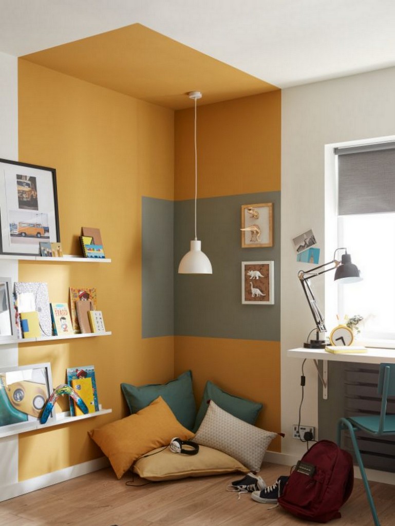 Créez un coin lecture et détente coloré dans un angle de la chambre de mini. Quelques coups de pinceaux suffisent pour délimiter un espace dédié. Posez un matelas de sol et quelques coussins par terre : le tour est joué.