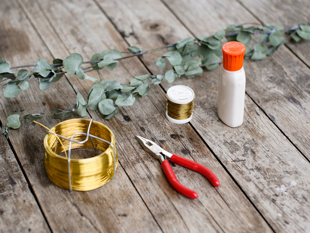 Pour réaliser des ronds de serviette avec de l’eucalyptus, il vous faut : du fil de laiton de deux épaisseurs différentes, une pince à couper, de la colle liquide et des branches d’eucalyptus. Commencez par former des cœurs avec le fil le moins épais et enroulez la pointe de chaque coeur autour d’un fil droit dépassant légèrement à l’intérieur du cœur. Collez une feuille d’eucalyptus sur le morceau de fil droit dépassant au centre de chaque cœur. Ensuite, utilisez le fil plus épais pour former un rond de serviette fait de plusieurs cercles. Enfin, reliez les tiges des cœurs au rond de serviettes. Bien entendu, vous pouvez réaliser ces ronds de serviettes avec toutes sortes de fleurs et de végétaux : laissez libre cours à votre imagination.