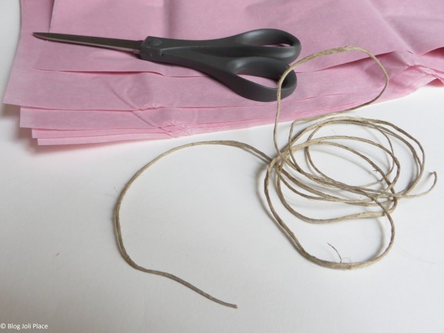 Pour créer vos fleurs en papier, il vous faut le matériel suivant : des feuilles de papier de soie des couleurs de votre choix, une paire de ciseaux et une bobine de ficelle. Vous trouverez le papier de soie dans les magasins de loisirs créatifs.