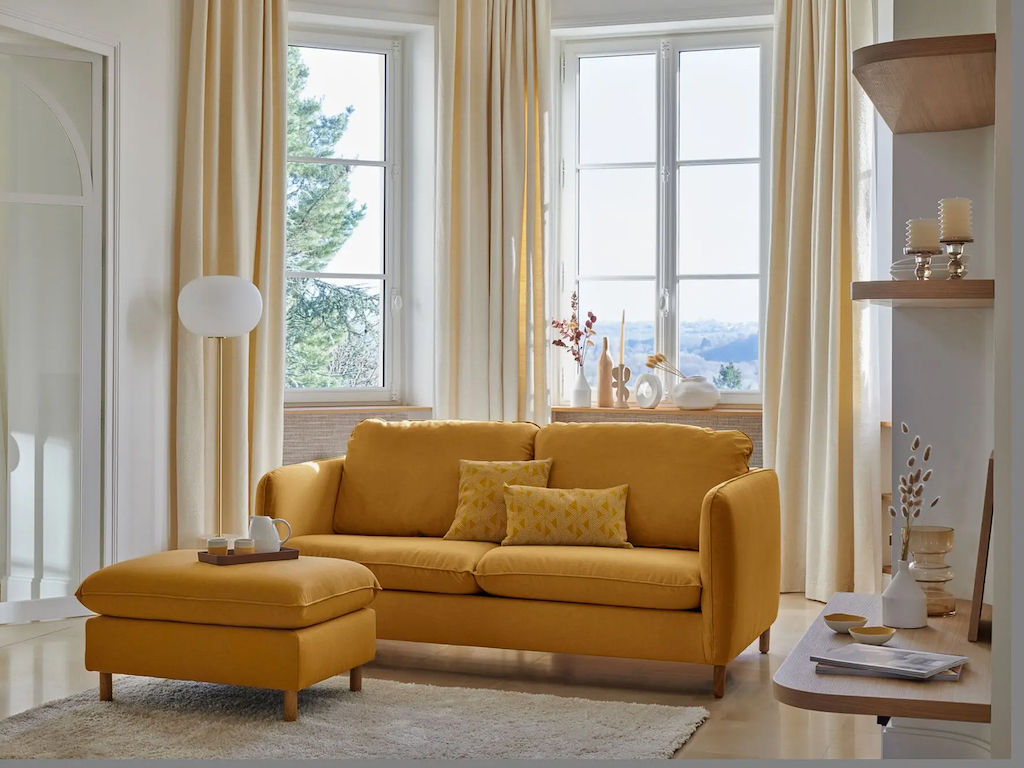 Vous n’osez pas adopter une pièce maîtresse jaune ocre, par exemple, un canapé ? Contentez-vous d’intégrer quelques objets couleur soleil dans votre déco comme une lampe, un bout de canapé ou un vase. Effet bonne mine garanti.