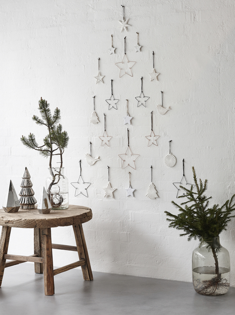 Tout le monde dehors ! Allez ramasser quelques branches de bois de différentes longueurs et fixez-les avec de la ficelle de chanvre. Pas besoin de trouver des branches parfaitement droites, l’imperfection de ce type de sapin DIY a beaucoup de charme. Fixez quelques branches de sapin et ornements sur votre réalisation et accrochez-la au mur.