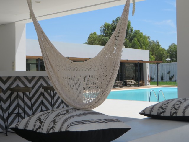 Dans la chambre, la déco fait la part belle aux tons neutres, aux matières naturelles et à l’artisanat local. Le lit est habillé de lin blanc et noir, d’oreillers moelleux et de coussins ethniques. Une suspension en rotin permet de créer une ambiance plus intimiste à la nuit tombée, un tabouret en bois brut sert de chevet, un tapis rond en jonc de mer réchauffe le sol. Les deux fauteuils blancs sont recouverts d’une housse en lin d’aspect loose, le bureau / coiffeuse est surplombé d’un grand miroir rond cerclé de cuir blanc et deux grands paniers permettent de ranger des coussins. Une large baie vitrée s’ouvre sur la terrasse prolongée par une piscine aux eaux turquoise. Certaines chambres, selon leur catégorie, disposent d’une terrasse plus grande équipée d’un hamac, d’autres ont leur piscine privée.