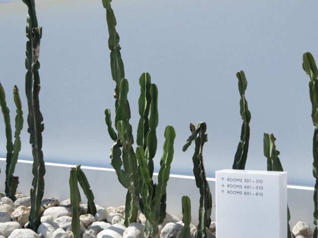 Des bâtiments blanc à l’architecture minimaliste abritent les chambres : ils sont tous bordés d’une piscine à laquelle chacun peut accéder par sa terrasse. Avec les cactus plantés dans les jardins, le ciel bleu et le paysage rocailleux, on se croirait presque en Californie mais le lointain bêlement des chèvres perchées sur la montagne nous rappelle que nous sommes bien en Grèce.
