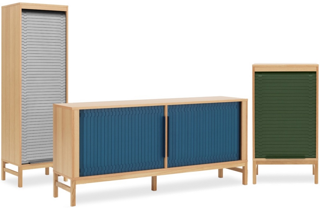 C’est en s’inspirant des montres-bracelets, des convoyeurs à bandes et du mobilier des années 50 que le designer danois Simon Legald a imaginé la gamme de meubles Jalousi pour Normann Copenhagen. Pour cette collection, il réinterprète le meuble à rideau coulissant en mélangeant le bois et la couleur, créant un beau contraste qui rajeunit considérablement ce classique. Composée d’un buffet et d’un meuble de rangement décliné en deux tailles, tous dotés d’un rideau coulissant en plastique, la gamme de meubles Jalousi permet de ranger toutes sortes de choses : classeurs et fournitures dans le bureau, vaisselle et verrerie dans la salle à manger ou livres et objets déco dans le salon. Et c’est bien l’idée de le détourner qui nous plaît le plus.
