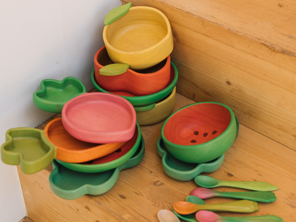 Inspirés des fruits et légumes préférés des enfants, les assiettes, bols et cuillères de la collection sont façonnés à la main. Chaque pièce nécessite 7 jours de fabrication, 13 étapes artisanales et le savoir-faire de 9 artisans. Le résultat, ludique et coloré, offre un design ergonomique adapté aux tout-petits.