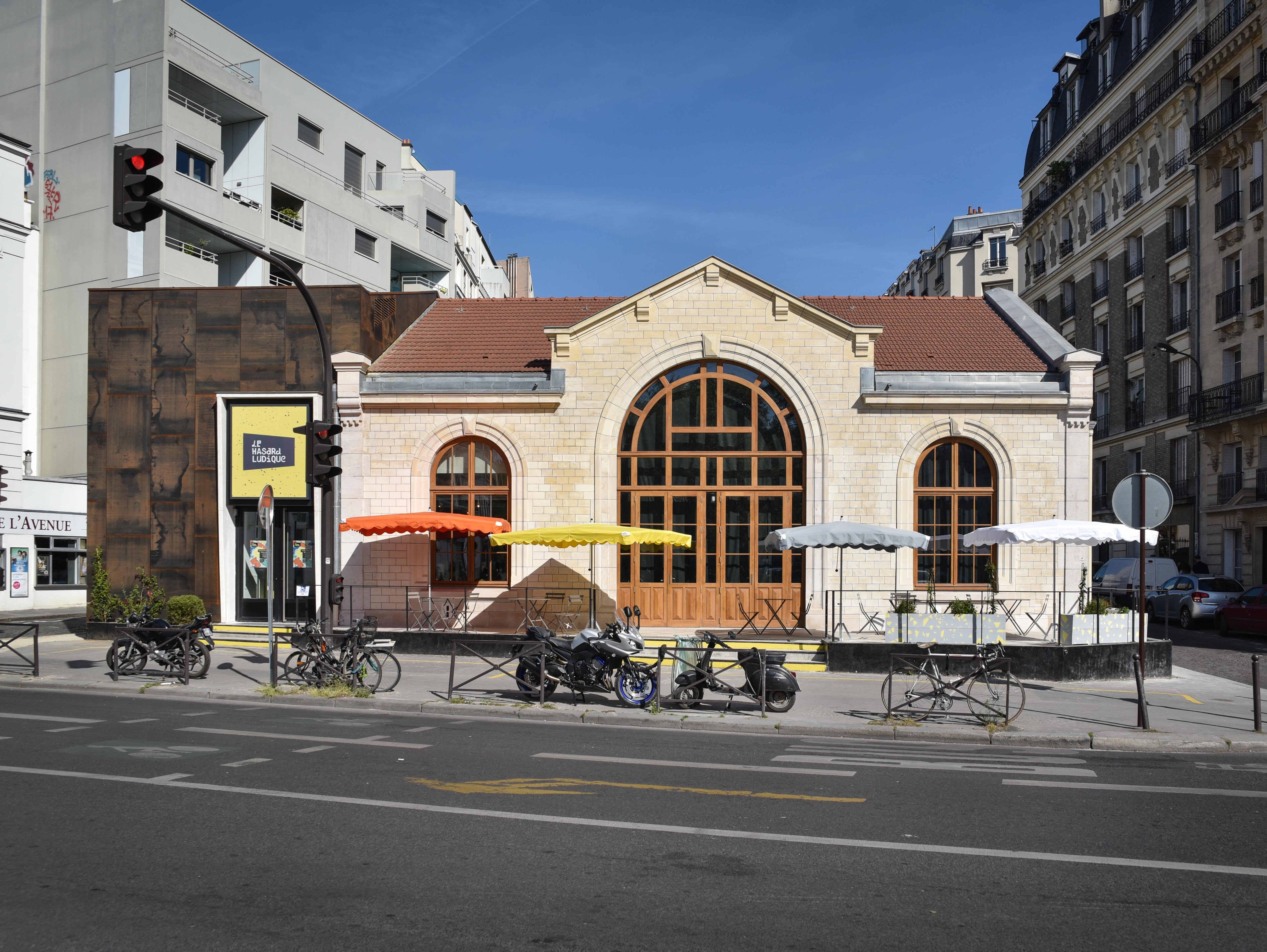 A Paris, la réhabilitation des anciennes gares de la petite ceinture poursuit son cours avec, cette fois, celle de l’avenue de Saint-Ouen. Construite en 1889, elle a eu plusieurs vies avant d’être récemment transformée en lieu culturel hybride où cohabitent une salle de spectacle, un atelier de pratique artistique collective et un bistrot gourmand. Ce nouveau lieu, baptisé le Hasard Ludique, a ouvert ses portes début mai. La conception du mobilier et de l’aménagement intérieur a été confiée au studio design Barreau Charbonnet qui a travaillé main dans la main avec Appelle Moi Papa, chargé de l’habillage et de la charte graphique du lieu. Les deux studios ont voulu inclure le public au processus créatif, proposant à une communauté de bénévoles constructeurs (appelés les bâtisseurs) l’opportunité de prendre part au projet. Balades pour trouver l’inspiration dans le quartier, workshops, construction du mobilier : les bâtisseurs se sont impliqués dans ce projet au même titre que ses initiateurs, avec les mots « hasard » et « ludique » pour fil rouge. Ainsi, le mélange de deux photos prises dans la rue par 2 bâtisseurs a donné le motif et la forme d’une chaise ; le mobilier a été pensé pour moduler le lieu selon le moment de la journée et son public ; les formes des miroirs reprennent celles des pierres de taille de la façade ; les dégradés de couleurs, inspirés des tags du quartier, ont été imaginé collectivement. Le résultat de cette initiative unique est un lieu coloré, conçu par tous et pour tous, ancré dans la culture et l’histoire locale. Découverte.
