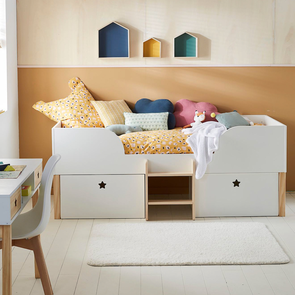 Pas simple de caser tout le bazar de junior dans sa chambre. Entre le lit, le bureau, l’armoire, la commode et les jouets, l’espace manque. Avez-vous pensé au lit combiné surélevé qui, comme son nom l’indique, combine rangements et couchage ? C’est une solution gain de place qui se décline de différentes façons. Il y a les modèles avec un lit surélevé sous lequel des tiroirs permettent de stocker vêtements et jouets : en prenant de la hauteur, le meuble évite toute perte d’espace au sol et c’est une option idéale pour une petite chambre. Certains de ces lits comprennent même un bureau coulissant. Et il y a les modèles bas dont le cadre s’habille d’étagères et de tiroirs, parfait pour disposer les livres et ranger  ses petites affaires. Dans les deux cas, c’est une idée futée pour optimiser l’espace sans tout changer.