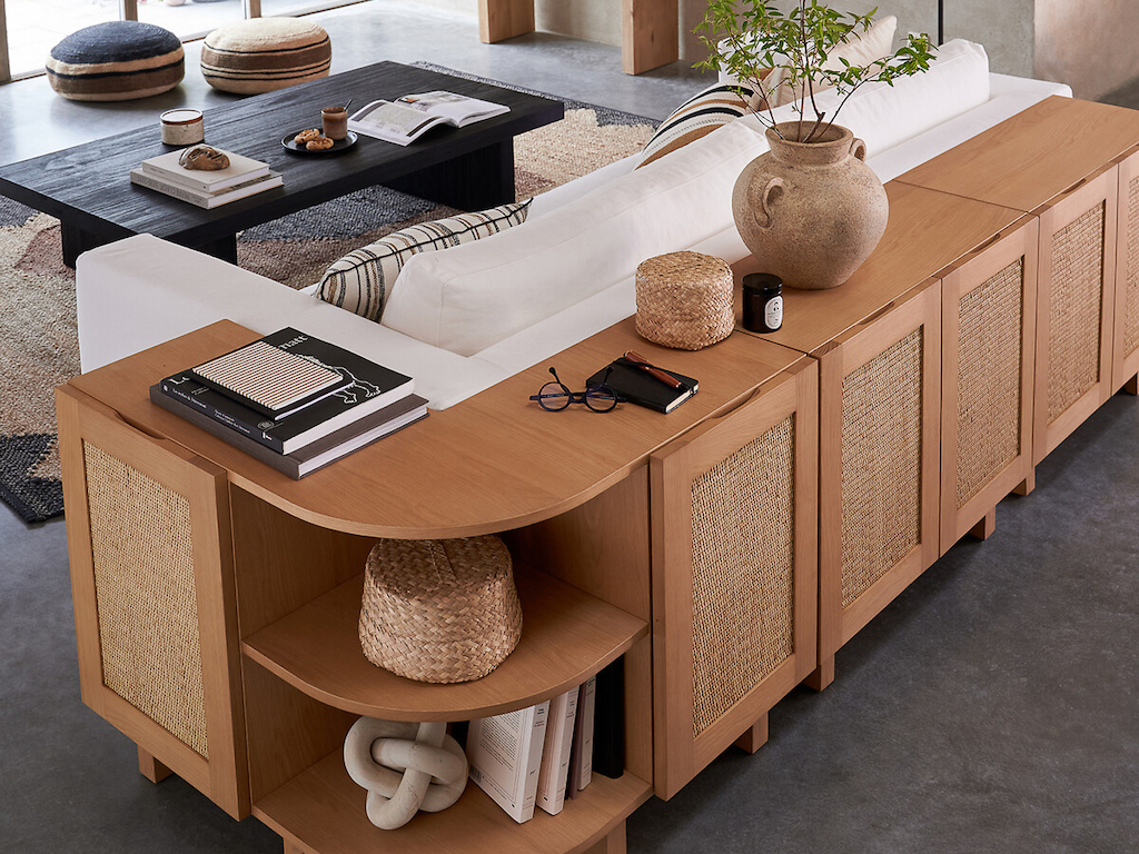 Vous ne trouvez pas le meuble qu’il vous faut pour habiller le dos de votre canapé ? Dans ce cas, nous vous donnons une astuce : détournez un banc TV au design minimaliste. Plus bas et plus long qu’une console ou qu’un buffet, il comprend des parties fermées pour ranger votre vaisselle ou vos papiers.