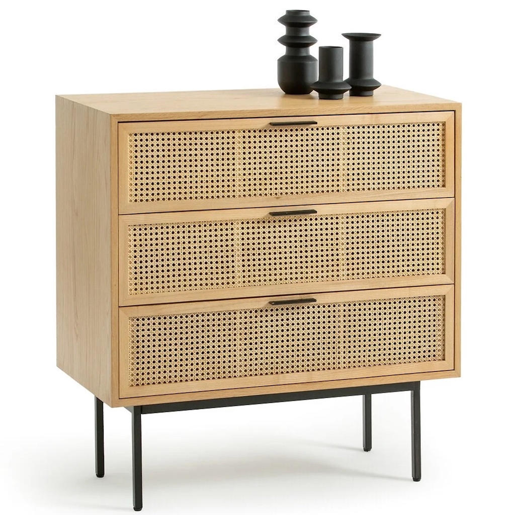 Depuis deux ans, le charme du cannage a envoûté la planète déco. Il a su se réinventer en habillant des meubles aux lignes contemporaines de son tissage élégant, parmi lesquels des commodes à placer dans l’entrée, le salon ou la chambre. Loin de l’image surannée que l’on s’en faisait, ce cannage-là est dans l’air du temps : il est laissé dans sa teinte naturelle, donnant du relief aux tiroirs sans en faire des tonnes.