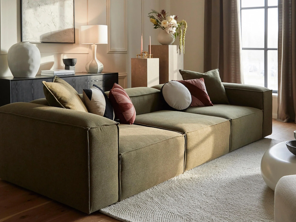 Un salon dans l’air du temps avec un canapé kaki