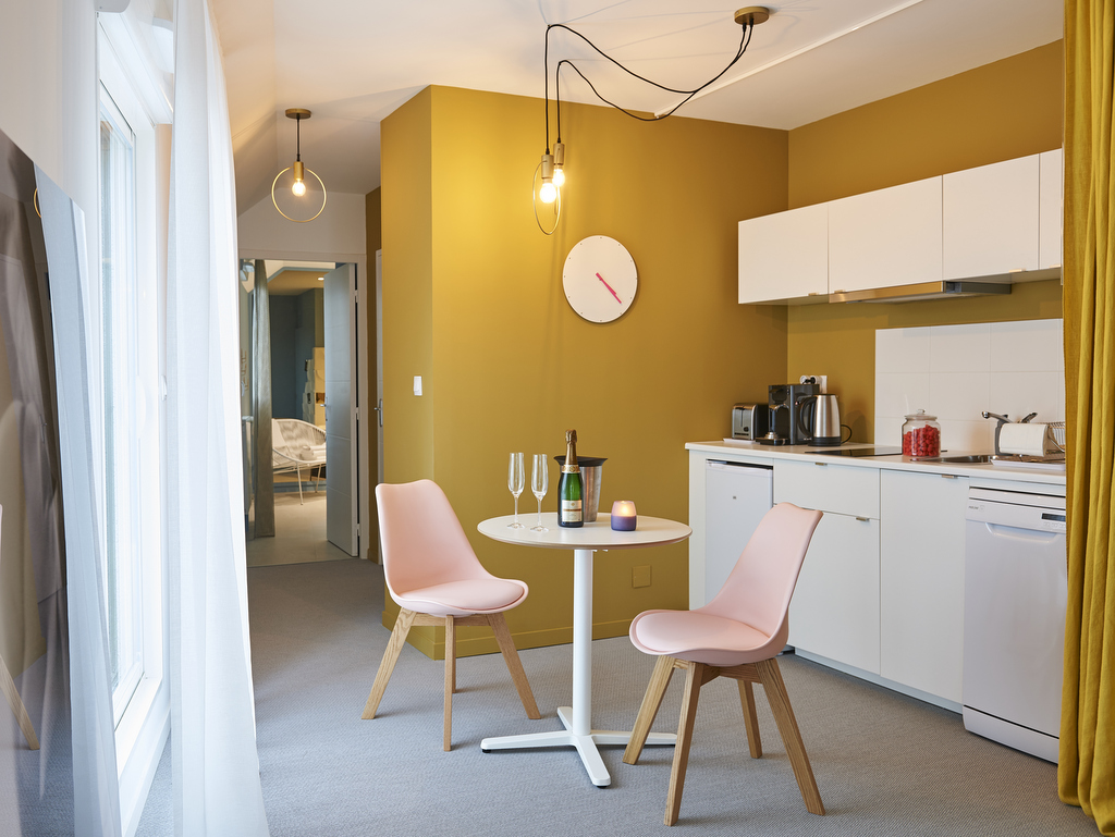 Dès l’entrée, les perspectives offertes par cet appartement de 55 m² attirent le regard. L’espace cuisine, mis en valeur par une peinture jaune moutarde, s’ouvre sur un salon aux belle proportions et à la décoration neutre, exposé plein sud. Les grandes fenêtres donnent sur la terrasse de 40 m² offrant une vue panoramique sur la ville. L’appartement, exploité par ses propriétaires en location de courte durée, dispose de plusieurs canapés clic clac permettant l’accueil d’une famille ou d’un groupe d’amis.