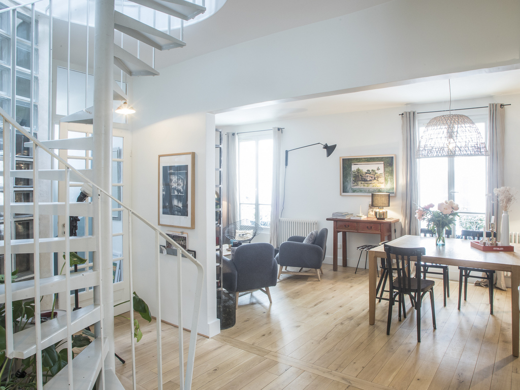 Doté de beaux volumes et de détails architecturaux charmants, l’atelier est un petit bâtiment sur cour composé de deux niveaux. Le premier niveau accueille une grande pièce à vivre à la cuisine ouverte. Un couloir mène à la chambre parentale et à sa salle de bain attenante. La fenêtre de la chambre donne sur un petit jardin d’hiver illuminé par une verrière et ouvert vers la cuisine. A l’étage, auquel on accède par un escalier en colimaçon, se trouve un espace de jeux et de loisirs ainsi que les chambres des enfants et leurs salles de bain.