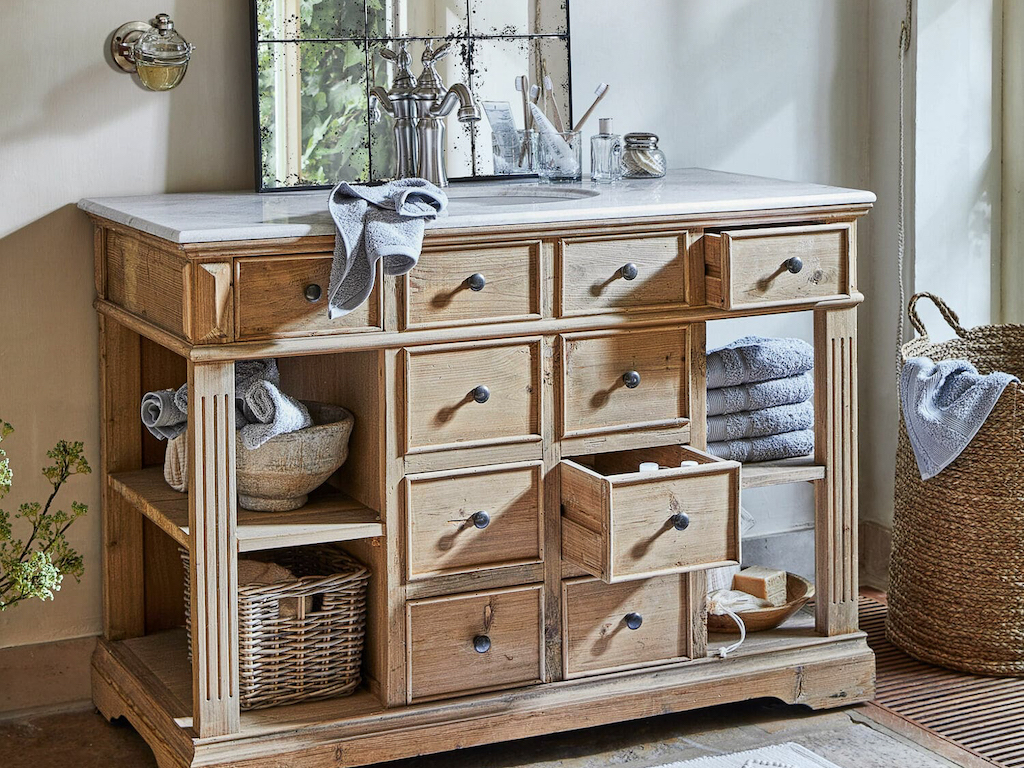 Dans une maison de charme, à la campagne ou en ville, le meuble vasque au style ancien est un choix judicieux pour la décoration de la salle de bain. En effet, il lui confère un style authentique qui ne dénote pas avec l’architecture et le cachet du lieu. Bien sûr, vous pouvez détourner un meuble de récup chiné dans une brocante, comme une commode ou un buffet, afin de le transformer en meuble de salle de bain. Cependant, cela nécessite d’abord de trouver un meuble adapté, puis de faire des découpes afin d’y ajouter un lavabo. Avec le risque d’abîmer votre meuble si vous ne maniez pas la scie sauteuse comme un pro. Alors, la solution la plus simple reste de choisir un meuble vasque ou sous vasque imitant le mobilier ancien, de style ou de métier.